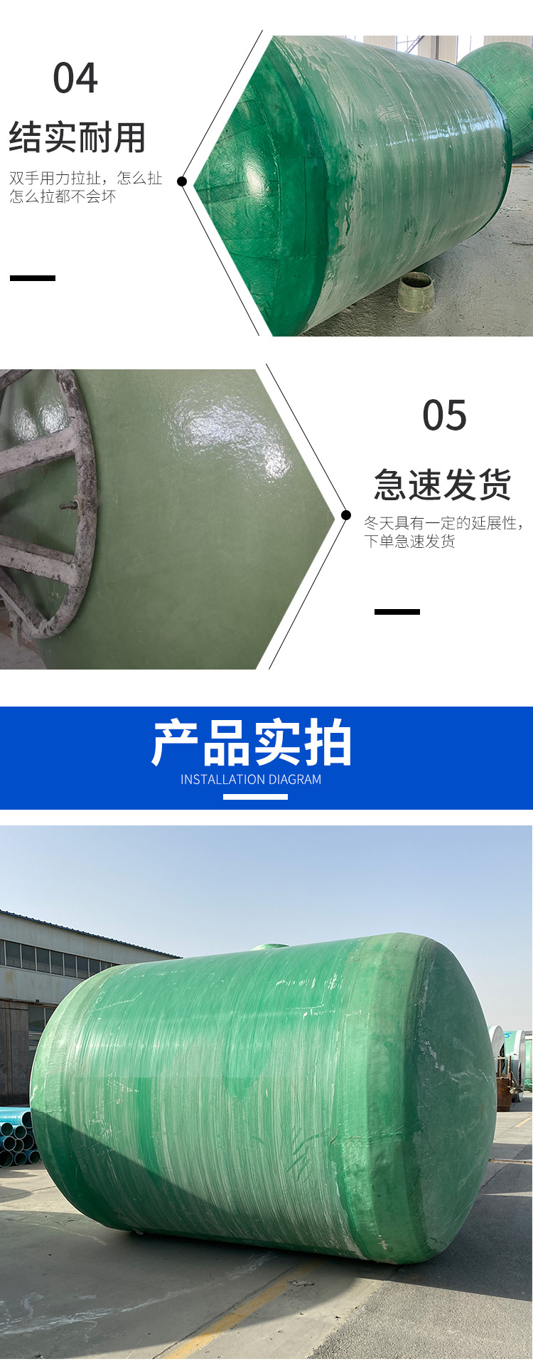 山東環通復合材料有限公司成立于2011年,是從事玻璃鋼儲罐產品的企業,公司位于山東濰坊安丘市。玻璃鋼儲罐分為:立式儲罐和臥式儲罐,有1立方、2立方3立方、4立方、5立方、10立方、12立方、15立方、20立方、25立方、30立方、50立方等,顏色分為:綠色、藍色、黃色等。公司產品主要分為:玻璃鋼儲罐容器,玻璃鋼化糞池,玻璃鋼隔油池,玻璃鋼加砂管道,玻璃鋼脫硫塔,玻璃鋼格柵,玻璃鋼防腐,玻璃鋼儲罐,玻璃鋼管件等。